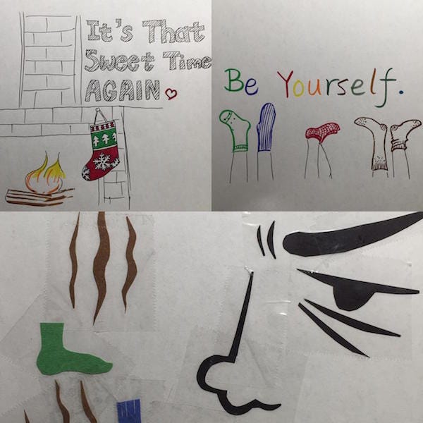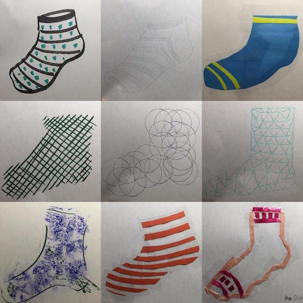 At first, it was easy to limit my tools only to pens. After using up markers, pencil and brush, my mind drained a little bit. Then, I saw my box of post-its -- ah ha, I cut them into pieces and made a "post-it" sock. Next, I searched my closet and found some construction paper and ribbons. I cut and pasted them into socks. Lastly, I used a combination of these tools to make a few others. Mission completed. There are many other ways to make images, such as cutting a potato in half and make prints -- I thought about this... Given I only had one potato left and needed to use it for cooking, I skipped this idea.