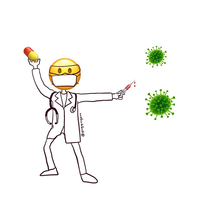 ๐ถ, ๐, ๐, ๐ฆ : A doctor fighting off viruses.