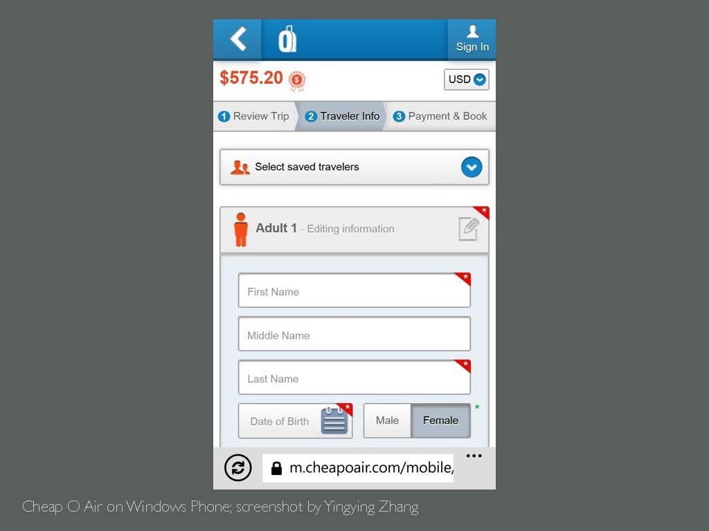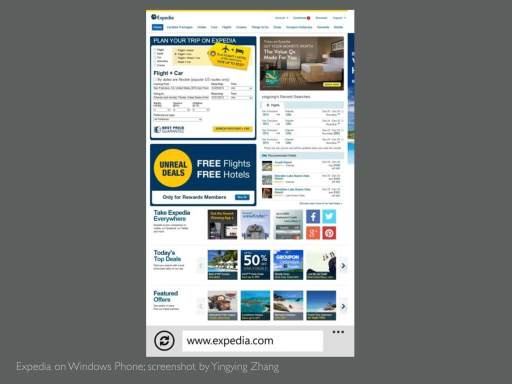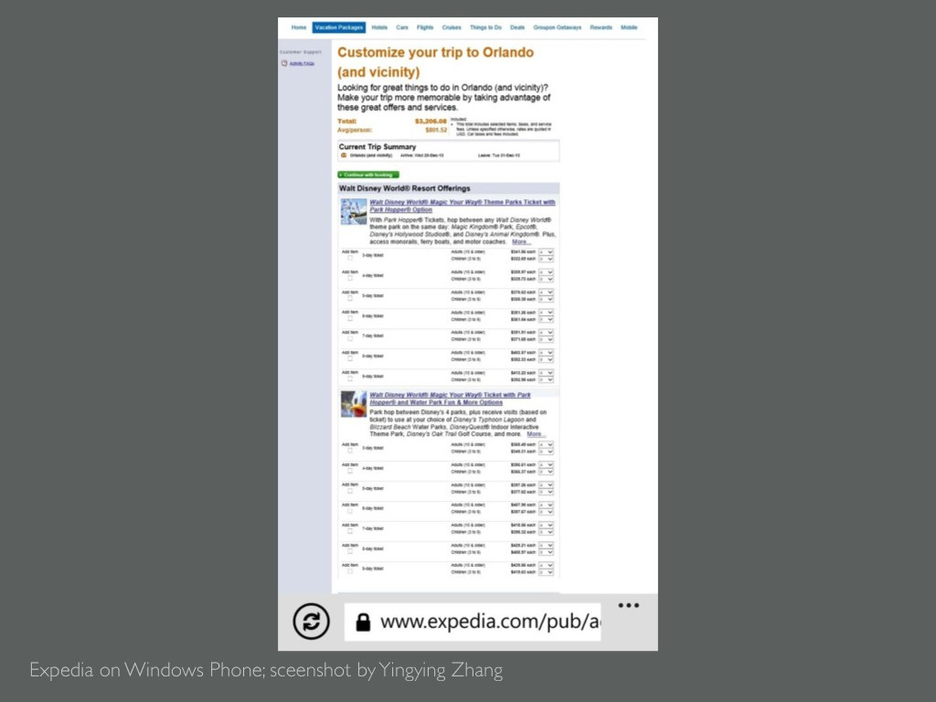 These problems are small, but they bother us, to some degree. They are like bee stings, not necessarily dangerous, but annoying if it happens often. What about good experiences? They allow us to accomplish what we want to do smoothly. It is that simple. But if it’s that easy, why there are still so many unpleasant experiences in every corner of our lives. What makes the difference? Here's my experience of booking a flight. End of last year, I needed to book flight tickets to Florida. It was a couple of weeks before departure, and ticket prices were rising every minute. I was in such a hurry, that I decided to purchase tickets on my touch screen smart phone, on the ferry back home. I opened the website, and the entire website crowded into my screen.