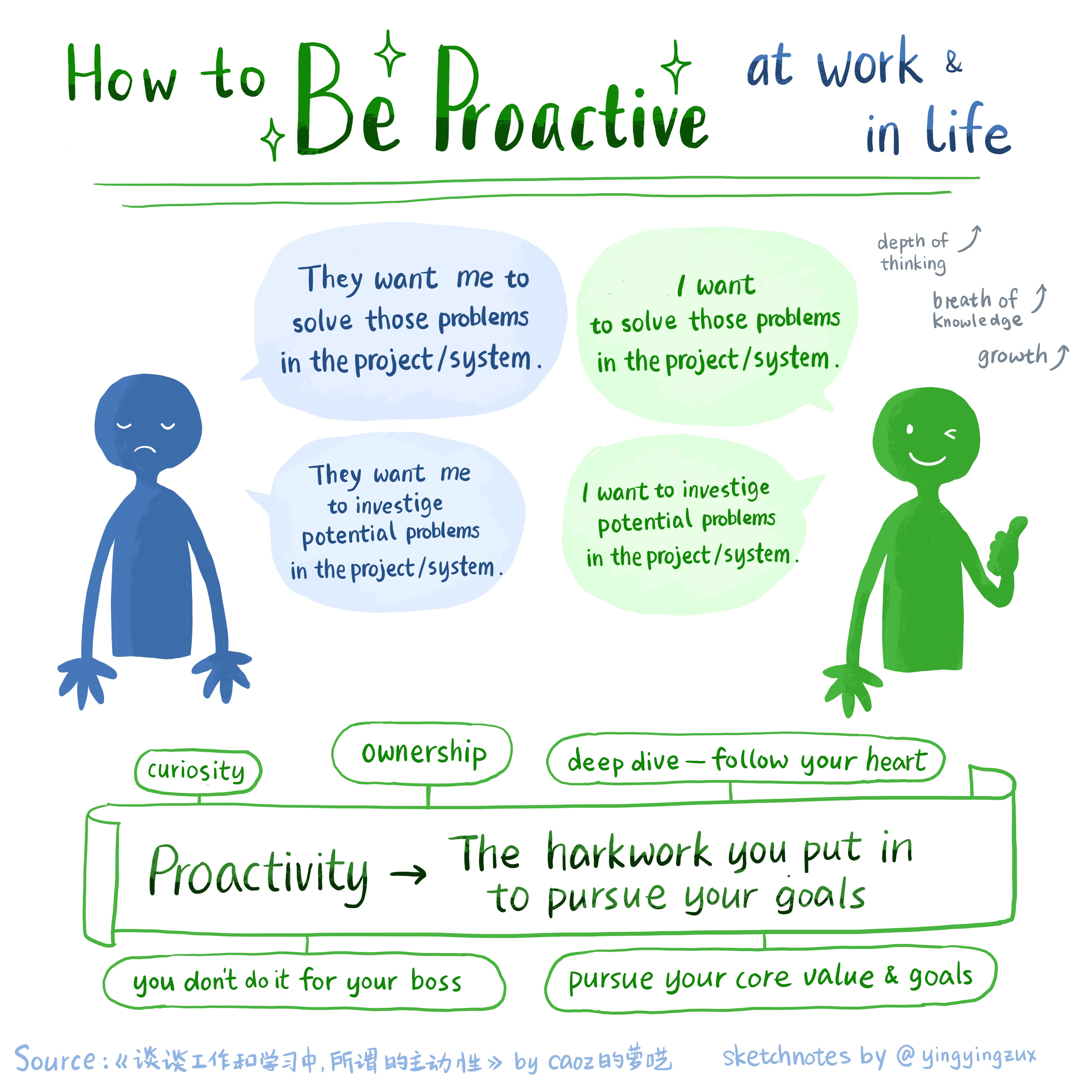 Cao Zheng, an author I respect, wrote about the difference between a reactive and a proactive mindset, and offers some tips for making the shift. I captured it in mysketchnotes below.