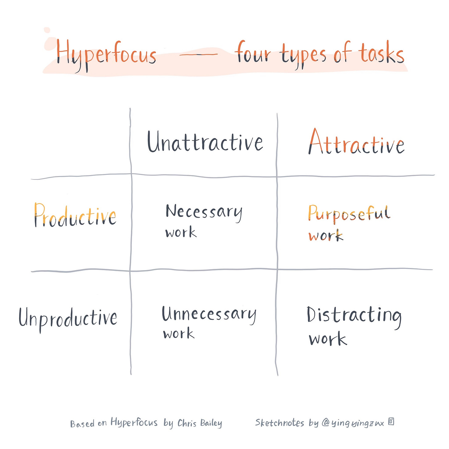 To enter hyperfocus mode, one must first distinguish between these types of tasks, understand their priorities, and consciously make reasonable use of one's attentional space during a given time period.