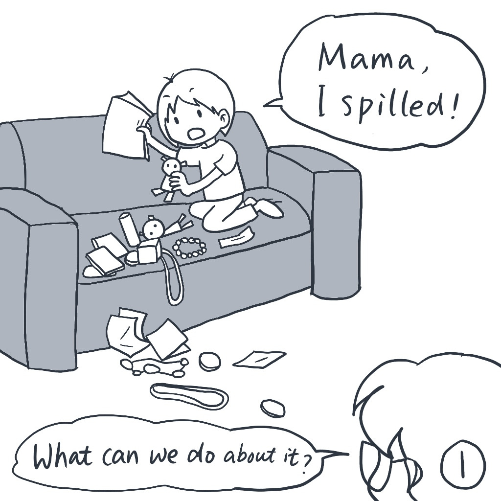 The other day, my toddler was playing when toys from her little bag spilled all over the couch. I heard her call out, “Mama, I spilled!”