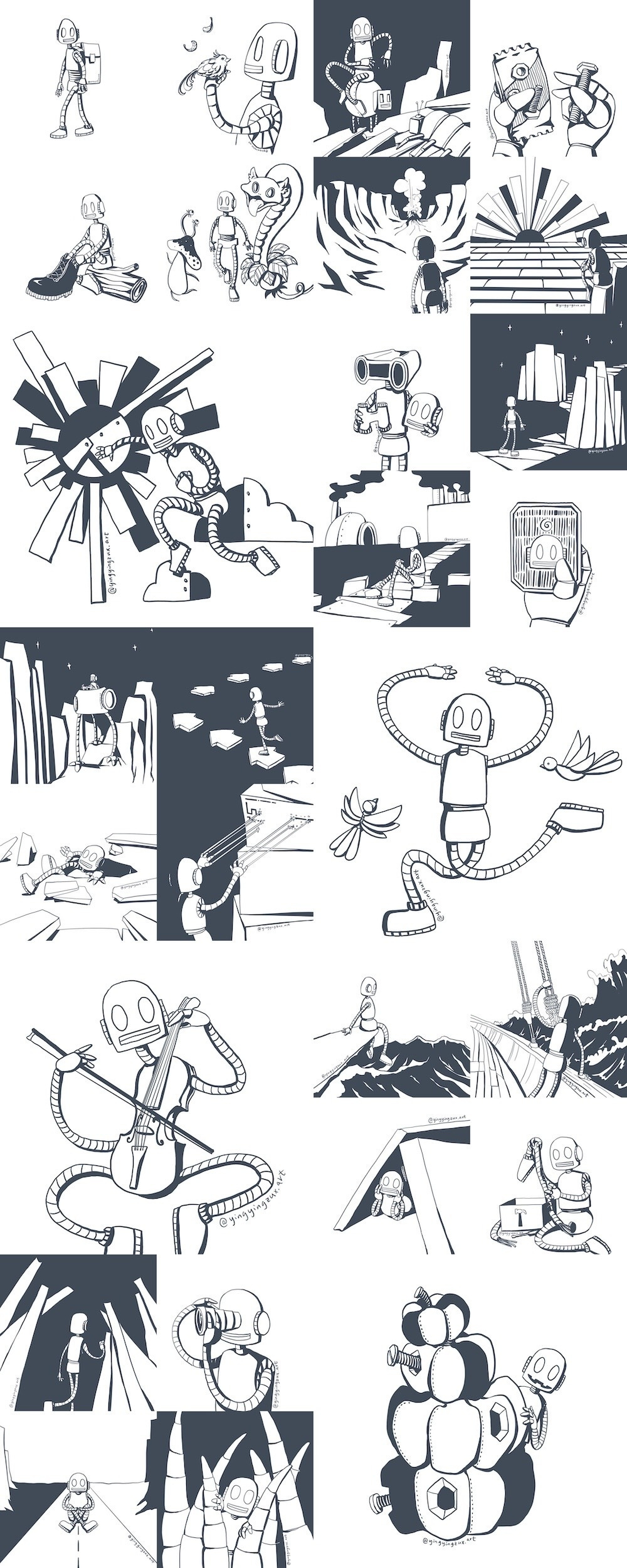 During this October's Inktober challenge, I completed 31 days of drawing. Inktober is an annual drawing event on Instagram where participants create one drawing each day based on 31 different prompts throughout October. In previous years, I would simply draw whatever came to mind based on the given keywords. This year was different – I created a little robot character who became the main character of all my drawings. I wanted to see what stories I could tell through this robot's adventures.